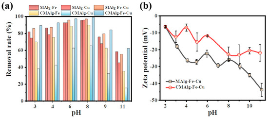 (a) The influence of the pH, (b) Zeta potential of MAlg-Fe-Cu and CMAlg-Fe-Cu aerogels.