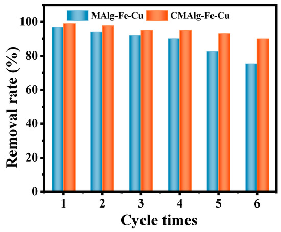 Adsorption cycles of TC by MAlg-Fe-Cu and CMAlg-Fe-Cu aerogels.