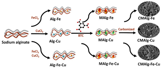 Sodium alginate is a natural linear polysaccharide obtained from brown algae, which has unique gel properties. The Fe3+, Cu2+ metal ions can independently ion-exchange Na+ in sodium alginate and chelate with alginate chain to produce Alg-Fe and Alg-Cu hydrogel with a “egg-box” structure. Alginate chains can also simultaneously chelate Fe3+ and Cu2+ alginate chains to produce AlG-Fe-Cu hydrogel. Subsequently, the hydrogel spheres as mentioned above are dispersed in an ethanol solution of organic ligand trimellitic acid to obtain MAlgs (MAlg-Fe, MAlg-Cu, and MAlg-Fe-Cu) hydrogel spheres with uniformly dispersed internal MOFs crystal particles. This is mainly because the metal ions are anchored in the three-dimensional network through the coordination of COO- related to guluronic acid on the alginate chain, which facilitates the further coordination of the anchored metal ions with the organic ligands to form crystal in situ. CMAlgs (CMAlg-Fe, CMAlg-Cu, and CMAlg-Fe-Cu) aerogel with multilayer pore structure was obtained by thermal decomposition based on MAlgs aerogel of in-situ grown MOFs materials as templates.