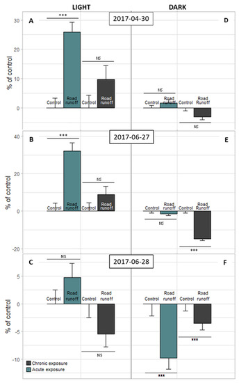 Activity (% of control) of 6 dpf old zebrafish larvae exposed to RR from C site in chronical and acute exposure (A–C): light condition; (D–F): dark condition. Control = E3 solution; number of larvae = 36 per condition; NS = not significant; * = p-value < 0.05; ** = p-value < 0.01; *** = p-value < 0.001 (non-parametric Kruskal–Wallis test). Error bars represent the standard error.