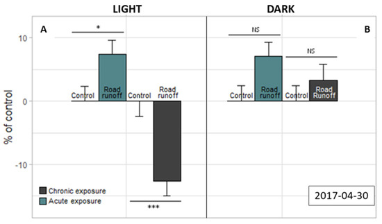 Activity (% of control) of 6 dpf old zebrafish larvae exposed to RR from R site in chronical and acute exposure. Light period (A); dark period (B). control = E3 solution; number of larvae = 36 per condition; NS = not significant; * = p-value < 0.05; ** = p-value < 0.01; *** = p-value < 0.001 (non-parametric Kruskal–Wallis test). Error bars represent the standard error.