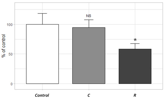 Inhibition of complex I of the mitochondrial respiratory chain induced by RR samples from the Compans (C) and Rosny (R) sites (2017-06-28 and 2017-09-14, respectively). Difference compared to control * = p-value < 0.05 (non-parametric Kruskal–Wallis test); NS = not significant.