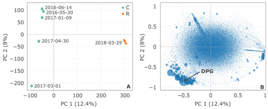 Principal component analysis of HRMS features. (A) Scores plot showing samples with corresponding sampling dates for the C and R sites; (B) Loadings plot showing all features detected in the samples, with the size of bubbles proportional to the highest intensity of a given feature among all samples.