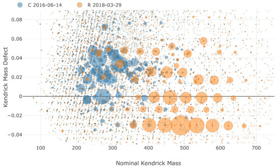 Kendrick mass defect plot for samples from C site (2016-06-14) and R site (2018-03-29), showing characteristic series of homologous compounds at the R site. The size of bubbles is proportional to the intensity of the features.