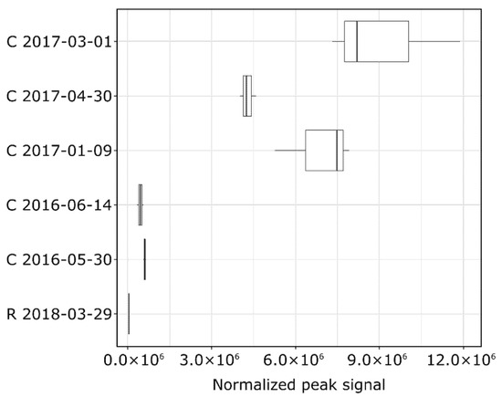 A principal component analysis was first performed using the table of features detected by HRMS from all samples to visualize the variability between the two sites and the various sampling times at the C site (Figure 4). For each sample, the three injection replicates were very close, demonstrating the instrumental stability. As already observed with results comprising even more samples and sites [9], the two sites were very well discriminated (along the first principal component PC1 representing 12.4% of the variance). The two sites indeed exhibited very distinct HRMS fingerprints, with more features and generally higher intensities in the C samples. Three samples from the C site exhibited similar HRMS profiles (2016-05-30, 2016-06-14, 2017-01-09) while one sample (2017-03-01) was very different and a last one (2017-04-30) showed an intermediate profile. These samples showed a high temporal variability in terms of detected features and were thus discriminated along with the second principal component (8% of the variance). Despite the lower number and intensity of features detected at the R site, it exhibited a very specific HRMS fingerprint (Figure S2).