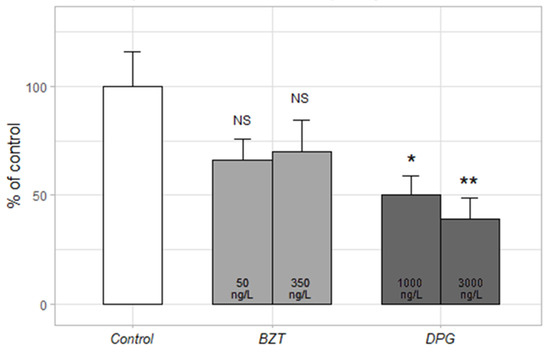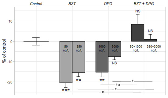 Activity (% of control) of 6 dpf old zebrafish larvae exposed to BZT and DPG in chronic exposure (dark period). Control = E3 solution, number of larvae = 12 per condition; NS = not significant; *: difference compared to control. # = p-value < 0.05; **, ## = p-value < 0.01, *** = p-value < 0.001 (non-parametric Kruskal–Wallis test). Error bars represent the standard error.
