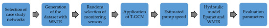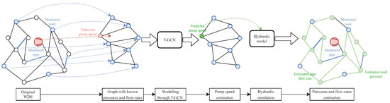 Figure 2 highlights the entire procedure proposed in this study. The first part shows the novel use of the T-GCN to estimate pump speeds in a specific location of a WDS (already presented in Section 2.1). Specifically, the process starting from the original WDS where the measurements are taken is highlighted. With the flow rates and pressure measurements from the network, the following step is the graph creation, which is the basis for the T-GCN model. Once the graph is built based on the correlation between its nodes, the graph is processed by the T-GCN, estimating the pump speed. Hereafter, the estimated pump speeds are used together with the already measured pressures and flow rates to calculate the flow rates in the non-monitored pipes and the pressures in the non-monitored nodes. The result is a complete estimation of the network status, which originates a digital twin of the base network hydraulic model. This resulting model is called the digital twin due to the capability of reproducing the operations found in the real network, even if no information about the control of pumps is provided.