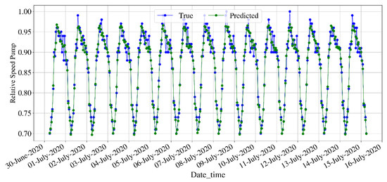 For quantitively characterizing the performance of the T-GCN on estimating the relative speed of pumps, the indicators presented in Section 2.2 are calculated. The is equal to 0.015 and the is equal to 0.011; the results of these two metrics reflect a high predictive capacity. The obtained for Network 1 is 0.972, a high value, showing, in general, the high accuracy of the model.