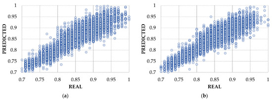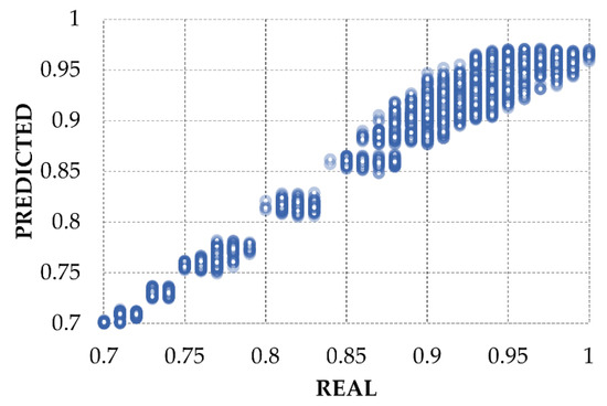 Based on Figure 4, it is possible to observe that T-GCN achieves a reliable performance on estimating relative speed. The estimation accuracy during the evening and night (low relative speed values) is better than that during the day. This is related to the operational rules for pump speed based on delivered flow in the network. Delivered flow is strongly correlated to the water demand, leading to more uncertainties during the day’s peaks. For better exploring the results of the T-GCN, estimated and real data are plotted in scatter graphs, shown in Figure 5. The errors for low relative speeds are lower than errors for higher speeds. For relative speeds lower than 0.85, the average error is lower than 0.05. Nevertheless, for relative speeds higher than 0.85, the error can achieve values around 0.1.
