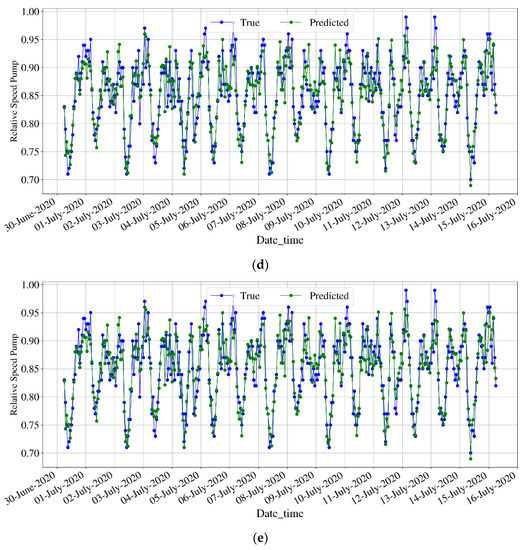Comparison curve of model predicted values and real values of the relative pump speeds for Network 2. (a) PU2, (b) PU4, (c) PU6, (d) PU8, (e) PU10.