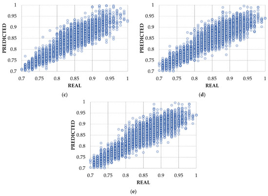 Scatter plots of predicted and real values of relative pump speeds for Network2. (a) PU2 (b) PU4 (c) PU6 (d) PU8 (e) PU10.