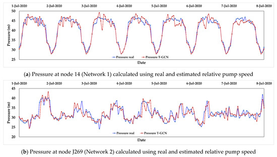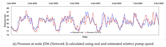 Figure 8 shows the comparison between the estimated pressure using a relative pump speed generated by the T-GCN and the real relative pump speed. It is observed that the predicted pressure variation at each node shows a similar behavior trend to the real pressure, which suggests that the T-GCN model is very effective in predicting SE in WDSs. For node J256, the relative pump speeds’ errors impact pressure estimation more, although the general trend remarkably matches the real values.