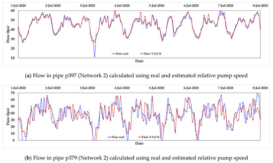 An analysis of the various graphs between the real flow rates of the C-Town network and the predicted flow rates is also performed. Figure 9 compares the flow calculated by the hydraulic model using real and estimated relative pump speeds. Figure 9a shows that the variation between predicted and real flow rates in the p397 pipe is minimal. In contrast, Figure 9b shows a more significant difference in the p379 pipeline when using the T-GCN model, but with results still close to the real ones.