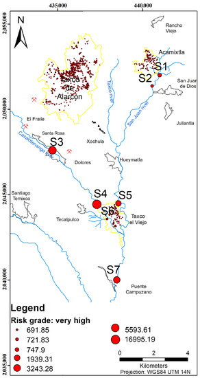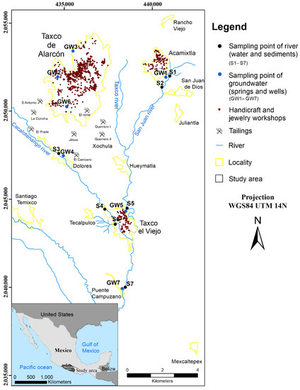 The San Juan River receives wastewater from nearby towns, as well as chemical waste from silversmiths for the manufacture of silver crafts and mining tailings [22]. The Cacalotenango River receives mine waste from La Concha and El Fraile tailings, as well as urban wastewater without treatment [23]. The Taxco River receives mine waste from several tailing piles along its flow, chemical waste from silversmiths and untreated urban wastewater [14,15].
