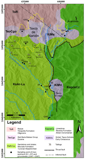 The Figure 2 summarized the geological map of the San Juan-Taxco River system showing the lithology. The bedrock in the area consists of Lower Cretaceous metamorphic rocks of the Taxco Schist Formation, Albian-Cenomanian limestone of the Morelos Formation, Upper Cretaceous sandstone and shale of the Mexcala Formation, Lower Tertiary red beds of the Balsas Formation and Middle Tertiary acidic volcanics of the Tilzapotla Formation [15,16].