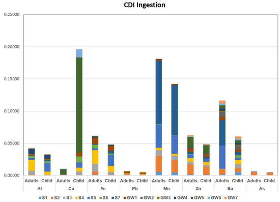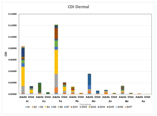 The CDI and HQ dermal values in adults were above the limit 1 for Al, Pb, Mn and As. Specifically, the values with a high impact on the indices for each element and the corresponding samples are as follows: (1) Al in samples S3, S4 and GW4; (2) Pb in samples S2, S3, S4, GW1 and GW3; (3) Mn in samples S1, S2, S3, S5 and S6; and (4) As only in samples S2 and S3. On the other hand, for children the CDI and HQ dermal values were above the limit of 1 for Pb, Mn, and Cu. The samples GW1 and GW3 were above the limit for Pb; whereas for Mn were the samples S5, S7; and finally, for Cu only in the sample GW5 (Table 4 and Figure 4).