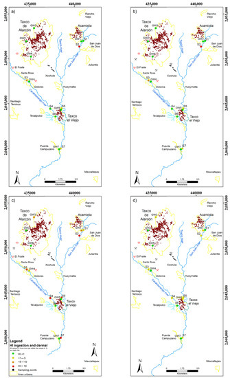 The results of PTE pollution in surface sediments of the San Juan-Taxco River system indicated that the contamination is relatively high. Several authors have documented the contamination until the closure of the mines and after the abandonment of the mining tailings [14,15,56,57]; the closure of the mines brought with it an increase in formal and informal crafts and jewelry workshops not only made of silver, but also of other alloys, such as alpakar, brass and tumbaga. The results indicate that the concentrations previously reported in the sediments do not coincide in order of abundance or in the same elements; in this work, the toxic elements present in order of abundance are Cd > Zn > Pb > Cu > As and before they were Pb > As > Zn > Fe [17,56].