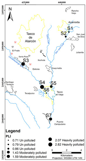 The PLI values estimated by sampling points ranged from 0.72 to 2.83 (Table 6). These indicate that samples S1, S2 and S6, where PLI was below 1, were unpolluted, the samples S5 and S6 were moderately polluted, while samples S3 and S4 were polluted. For computing the global value, it was necessary to consider all the samples and correct for points S1, S3, S5, S6 and S7, which do not contain As and Cr; therefore, n = 12. The global value of PLI for the entire study area was 1.29, which makes it a moderately contaminated area (Figure 6). This indicates that the San Juan, Taxco and Cacalotenango rivers are in a state of contamination due to the influence of the 13 PTEs evaluated, with Cd, Zn, Pb and Cu being the most influential elements.