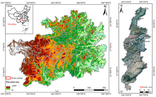 (a) Location of Guizhou province and Pu’an county; (b) Location of study area.