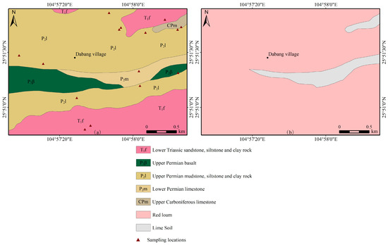 (a) Geology map of Dabang village study area; (b) the distribution map of red loam and lime soil in the study area.