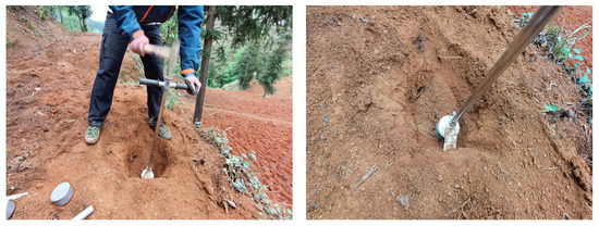 When utilizing TRIGRS for simulation, geotechnical parameters, such as unit weight (), internal friction angle (), cohesion (), and saturated hydraulic conductivity (), hydraulic diffusivity (), saturated water content () and residual water content () of the soil must be input. A total of 15 sampls locations were taken for field sampling in the Dabang village study area (Figure 2a and Figure 3). We collected undisturbed samples at depths ranging from 1 m to 1.2 m at each sampling location. In total, 18 samples of red loam and 12 samples of lime soil were collected. The parameters were measured by laboratory static triaxial and variable tap penetration experiments (Table S1). The average of the measurements for each parameter was taken as the input to TRIGRS (Table 1) [57]. As for the saturated water content and residual water content, this study took the parameters of corresponding soil types in the geotechnical handbook of the neighboring area with similar geology and geomorphic setting [58,59,60]. The input parameters of each type of soil were assigned to each grid cell based on the distribution map of the soil types in the study area (Figure 2b).