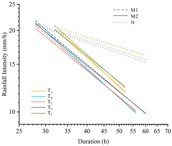 Figure 5 shows that the defined I-D thresholds conform to the power law equation, that is, the intensity decreases with the increase of duration. Moreover, the defined I-D thresholds without screening have the highest position on the lg–lg coordinates, M1 is the second and M2 is the lowest.