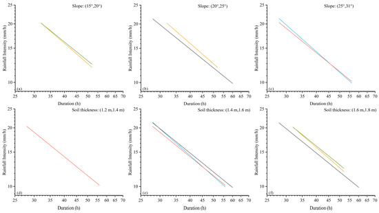 (a–c) Intensity–duration threshold curves separated in average slope for the slope units with critical rainfall; (d–f) intensity–duration threshold curves separated in soil thickness for the slope units with critical rainfall.