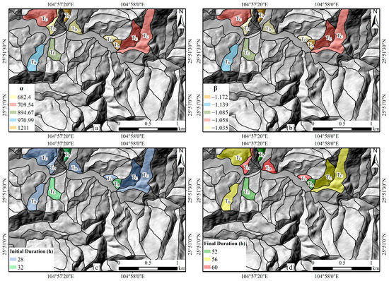 Maps of α, β, initial and final durations were generated to indicate that each slope unit with critical rainfall has a corresponding I-D threshold (Figure 7, Figure 8 and Figure 9).