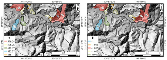 Maps representing the defined I-D thresholds after M2 screening for each slope unit: (a) scale parameter α; (b) shape parameter β.