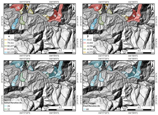 Maps representing the defined I-D thresholds after M1 screening for each slope unit: (a) scale parameter α; (b) shape parameter β; (c) initial duration; and (d) final duration.
