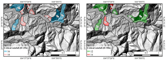 The critical intensity of 10 slope units when D = 35 h and D = 50 h was determined by the simulation of TRIGRS (Figure 10).