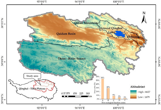 Qinghai Province is located in the northeastern part of the Plateau, between 89°25′–103°04′ E and 31°39′–39°11′ N, with a region of 717,500 square kilometers (Figure 1). Based on the ecological environment zoning management and control system, which from the perspective of ecological and environmental protection, promote differentiated and refined management in different regions, it has been divided into five ecological function zones in the province’s administrative regions by the Qinghai Provincial government: (1) the Three-River Source region; (2) the Qaidam Basin region; (3) the Qilian Mountain region; (4) the region around Qinghai Lake; and (5) the Hehuang region. Among them, the Three-River Source region, which is the birthplace of the Yellow River, the Yangtze River, and the Lancang River, focuses on water conservation and biodiversity function maintenance to ensure the water source of the “Asian Water Tower”; the Qilian Mountain region, an important water source in the Hexi Corridor of China, such as the Shiyang River, Heihe River, and Shule River, focuses on the ecological management and restoration to improve the water conservation function; the region around Qinghai Lake focuses on maintaining biodiversity function to promote the positive cycle of the watershed, woodland, grassland and wetland ecosystems, and biodiversity ecosystems; the Qaidam Basin region focuses on coordinating the relationship between protection and development, protecting the original ecological surface and landforms, and rationally developing mineral resources; and the Hehuang region focuses on the restoration and rehabilitation of the environment.