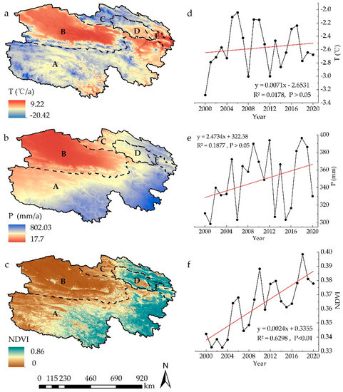 The spatial distribution and temporal changes of annual average T (a,d), P (b,e), and NDVI (c,f) in Qinghai Province during 2000–2020. A–E in the figure represents the Three-River Source region, the Qaidam Basin region, the Qilian Mountain region, the region around Qinghai Lake, and the Hehuang region, respectively.