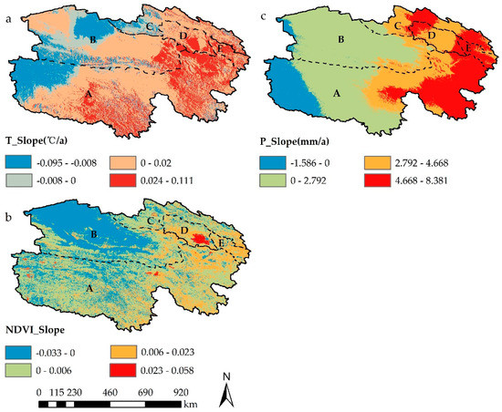 Spatial changes of T (a), NDVI (b), and P (c) in Qinghai Province during 2000–2020. A–E in the figure represents the Three-River Source region, the Qaidam Basin region, the Qilian Mountain region, the region around Qinghai Lake, and the Hehuang region, respectively.