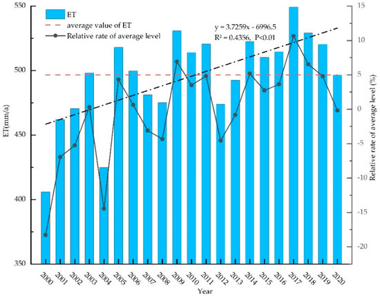 Figure 4 shows that average ET variations in the study region during 2000–2020. ET has ranged from 405.88 to 549.3 mm in Qinghai Province over the 21 year period. The multi-year mean ET was 496.56 mm. The lowest and highest ET were 405.88 and 549.3 mm, occurring in 2000 and 2017, respectively. The average annual ET showed a significant increasing trend (R2 = 0.43, p < 0.01) and increased at a rate of 37.26 mm/decade. In addition, the relative rate of average level distance showed that the annual average change of ET ranged from −18% to 11%. Before 2009, the rate of change was primarily negative, and after 2009, it was mostly positive.
