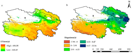 Spatial distribution (a) and changes (b) of ET in Qinghai Province during 2000–2020. A–E in the figure represents the Three-River Source region, the Qaidam Basin region, the Qilian Mountain region, the region around Qinghai Lake, and the Hehuang region, respectively.
