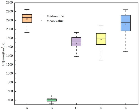 Characteristics of ET per unit region in five ecological function zones in Qinghai Province during 2000–2020. A–E in the figure represents the Three-River Source region, the Qaidam Basin region, the Qilian Mountain region, the region around Qinghai Lake, and the Hehuang region, respectively.