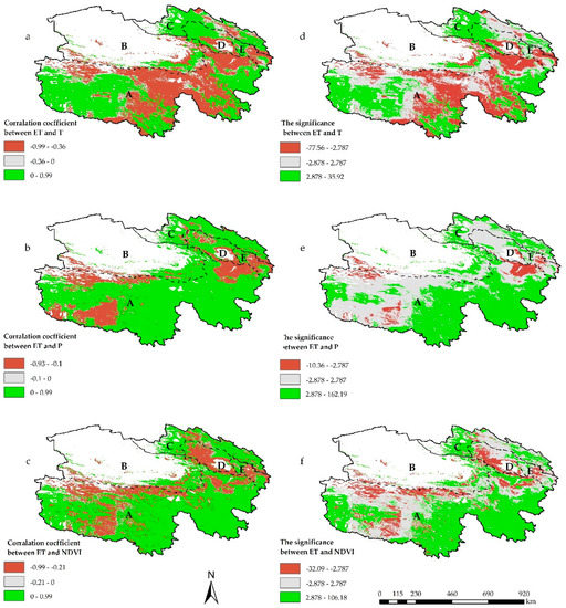 Spatial correlation coefficient distribution map of ET and T, P, and NDVI. (a–c) represent the correlation coefficient between ET and T, P, and NDVI; (d–f) represent the significance test between ET and T, P, and NDVI. A–E in the figure represents the Three-River Source region, the Qaidam Basin region, the Qilian Mountain region, the region around Qinghai Lake, and the Hehuang region, respectively.