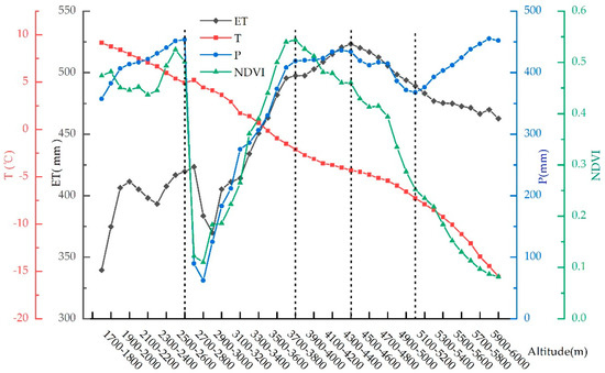 The altitude is one of the critical factors that affects the heterogeneity pattern of ET [67,68]. It affects environmental variables, such as NDVI [69], by affecting climatic conditions, such as T and P, thereby impacting ET. The Plateau was found to have a complex topography, and its average altitude was much higher than that of the surrounding regions at the same latitude. Therefore, it was crucial to analyze the relationship between the altitude gradient and T, P, NDVI, and ET.