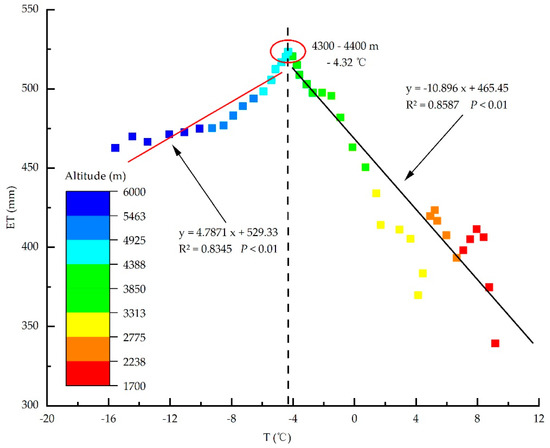 In summary, the T was the main driving factor for ET on the altitude gradient in Qinghai Province, followed by P, and NDVI had no significant impact on ET. At the same time, the driving variability of ET on the altitude gradient was apparent, changing from P driving to NDVI and T driving with increasing altitude, which was roughly the same as the research results of the Mongolian Plateau and Qinghai Lake [56,78]. Interestingly, ET has prominent distribution characteristics affected by T on the altitude gradient (Figure 9): In regions where the average annual T was less than −4.32 °C and the altitude was less than 4400 m, ET rose significantly (R2 = 0.86, p < 0.01). In regions where the annual average T was higher than −4.32 °C, and the altitude was higher than 4400 m, ET decreased significantly (R2 = 0.83, p < 0.01). However, P and NDVI had no similar performance. The correlation between P and ET on an altitude gradient was only 0.2 (p < 0.01), and the correlation between NDVI and ET was not significant (p > 0.05).