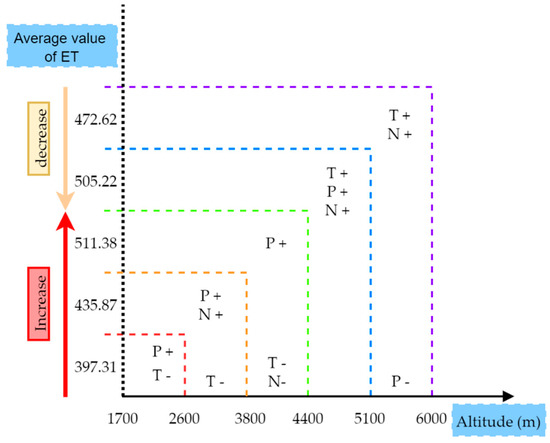 Diagram of influencing factors of ET in Qinghai Province. “+” “−” refers to the positive or negative effects of driving factors varying with altitude gradient on ET.