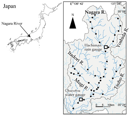 Location of the Nagara River Basin (Left) and the Nagara River and its four main tributaries (Right). The black dots indicate the environmental DNA survey sites in this study. The flow observation data used for the validation of the hydrological model were obtained from the Chusetsu water gauging station located in the downstream of the Nagara River. The precipitation data from the Hachiman rain gauge located at the upstream of the basin are shown in Figure 3.