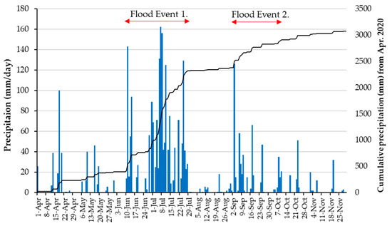Precipitation at Hachiman rain gauge (April–November 2020). Blue bars show daily precipitation (mm/day) and black line shows cumulative precipitation (mm) from April 2020. In the 52 days from 10 June to 30 July, a total of 1923 mm of precipitation was observed. In this study, this precipitation was defined as Flood Event 1. Another 528 mm of precipitation was observed in the 38 days from 2 September to 10 October, defined as Flood Event 2.