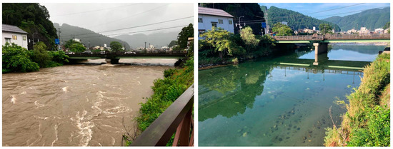 Scenes during and after the flooding of the Yoshida River near the confluence with the Nagara River. This point is also near the Hachiman rain gauge. These photographs were taken by Tsuguki Komori on 6 July and 18 August 2020, respectively.