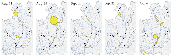 eDNA concentrations of Plecoglossus altivelis changed spatially and temporally in the Nagara River Basin (11 August–6 October 2020). The black dots show the eDNA survey points. The sizes of the yellow circles indicate the eDNA concentrations of P. altivelis.
