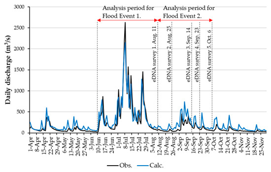 Daily flow hydrograph (black line) and Rainfall–Runoff–Inundation model calculation results (blue line) for the Chusetsu water gauging station (April–November 2020). The Nash–Sutcliffe model efficiency coefficient and coefficient of determination values were 0.83 and 0.88, respectively, indicating that the reproduced calculation results were sufficiently accurate. In the figure, the days when environmental DNA (eDNA) surveys were conducted are indicated by dotted lines.