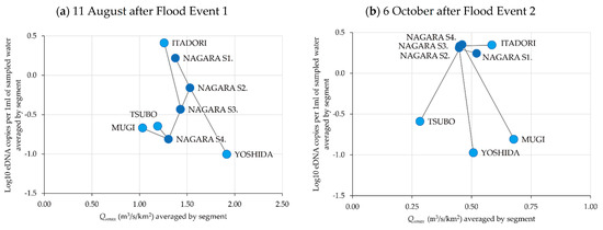 The mean eDNA concentration varied among the river segments after Flood Event 1 (Figure 8a). The relationship between Nagara S1 and the Yoshida River located in the upper reaches and Nagara S2 located downstream of their confluence illustrated that the higher the flood magnitude, the lower the average eDNA concentration. Similarly, focusing on the relationship between Nagara S2 and the Itadori River and Nagara S3 downstream of their confluence, higher average eDNA concentrations were found in the Itadori River, which had the lowest flood magnitude. After Flood Event 2 (Figure 8b), a different trend was observed. The eDNA concentrations in the entire mainstem of the Nagara River and in the Itadori River became uniform. Conversely, the eDNA concentrations in the Yoshida, Mugi, and Tsubo Rivers, which were low immediately after Flood Event 1 (Figure 8a), remained low after Flood Event 2.