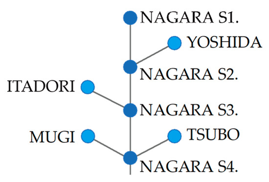 Schematic image of segment connection. These plots show the connection relationships between the four major tributaries (light blue) and four mainstem segments of the Nagara River (blue) plotted in Figure 8.