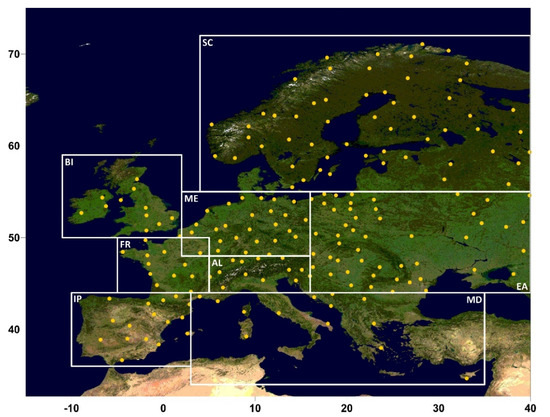 The 196 ECA&D stations used (yellow dots) and the division of the domain into eight smaller subregions (white lines). The subregions are: the Alps (AL), the British Isles (BI), Eastern Europe (EA), France (FR), the Iberian Peninsula (IP), the Mediterranean (MD), Mid-Europe (ME), and Scandinavia (SC) [24].