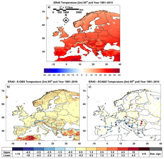 Extreme high mean temperature (°C) (95th percentile) for (a) ERA5, and the differences between (b) ERA5 and E-OBS, and (c) ERA5 and ECA&D stations.
